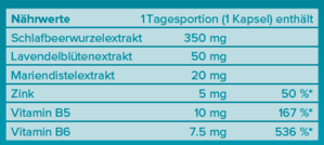 Schlafbeerwurzel-Trockenextrakt DER 5:1 - 8:1,63.2 % (350 mg), Lavendelblüten-Trockenextrakt DER 4:1,9 % (50 mg), Mariendistel-Trockenextrakt DER 20:1 3.6 % (20 mg), Zinkbisglycinat, Vitamin B5, Vitamin B6, Trenn-mittel: Magnesiumstearat, Kapselhülle: Hydroxypropylmethylcellulose